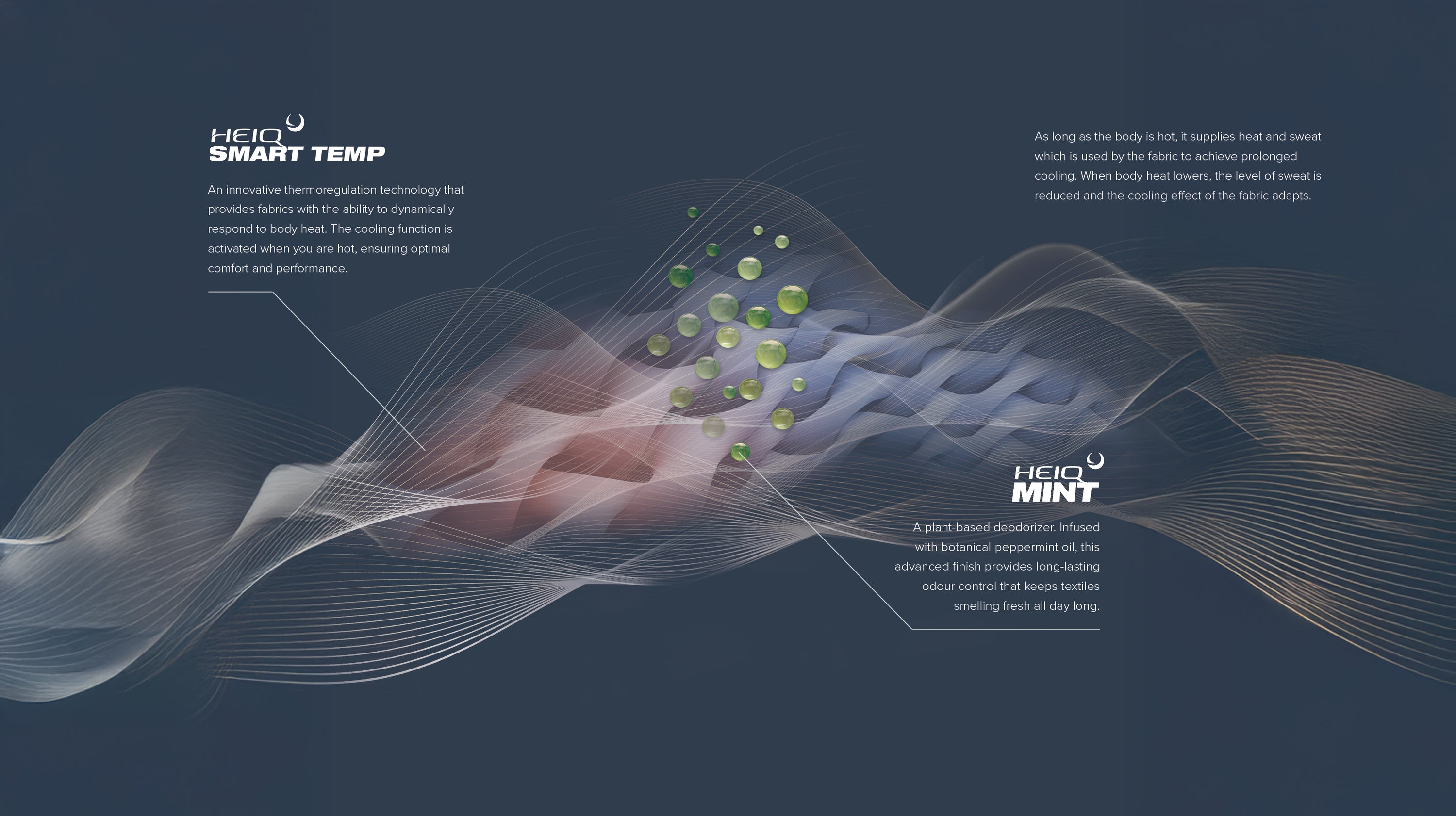 HeiQ Smart Temp™ is a textile treatment that changes passive textiles to textiles with a dynamic response to temperature changes. This technology merges intelligent cooling with a plant-based deodorizer, HeiQ Mint™, that regenerates at every wash to ensure over 40 laundries of peak performance. By activating a responsive cooling effect only when you need it most, it guarantees you stay dry, fresh and perfectly comfortable all day long.